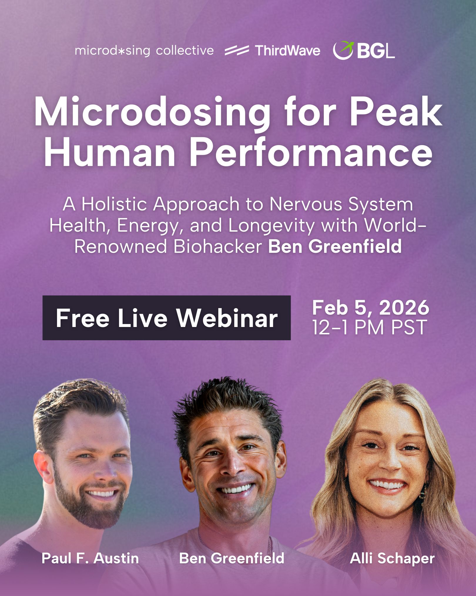 Join Microdosing Collective and Third Wave for a free live webinar with special guest Ben Greenfield, New York Times Best-Selling Author, World-Renowned Biohacker & Performance Expert, as we explore how microdosing can be integrated into a broader wellness strategy to push past plateaus and support your highest performance.